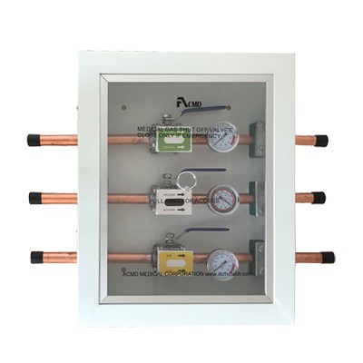 El conjunto frontal es una ventana de cubierta fácilmente removible con un anillo de tiro. La ventana oculta las tuberías y las válvulas dentro de la caja y está etiquetada como "Precaución - Válvulas de cierre de gas médicas - Cerrar solo en emergencia". La colocación de las válvulas dentro de la caja de válvulas de la zona debe ser tal que la ventana removible no pueda ser reemplazada cuando alguna válvula esté cerrado.